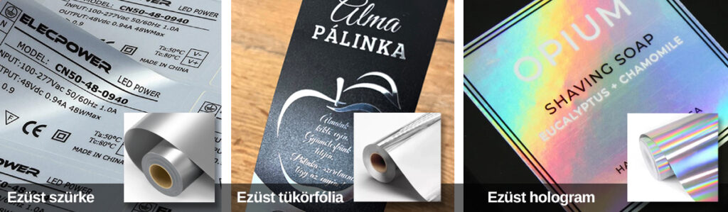 A max. 210×150 mm méretű matricák, vízálló, műanyag, ezüst tükörfólia vagy ezüst hologram öntapadó anyagra készülnek.